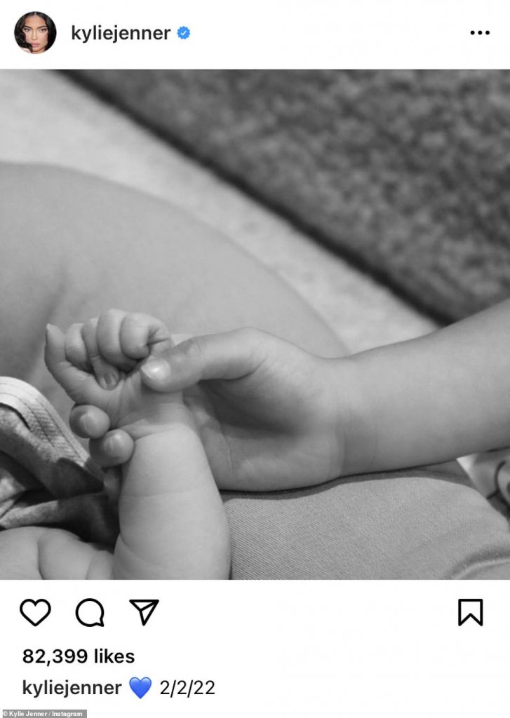 Kylie made the announcement earlier today by posting a black and white photo showing what appears to be their 4-year-old daughter, Stormi, holding a newborn’s hand. In the caption is a blue heart emoji with the coolest birth date ever; 2-2-2022.